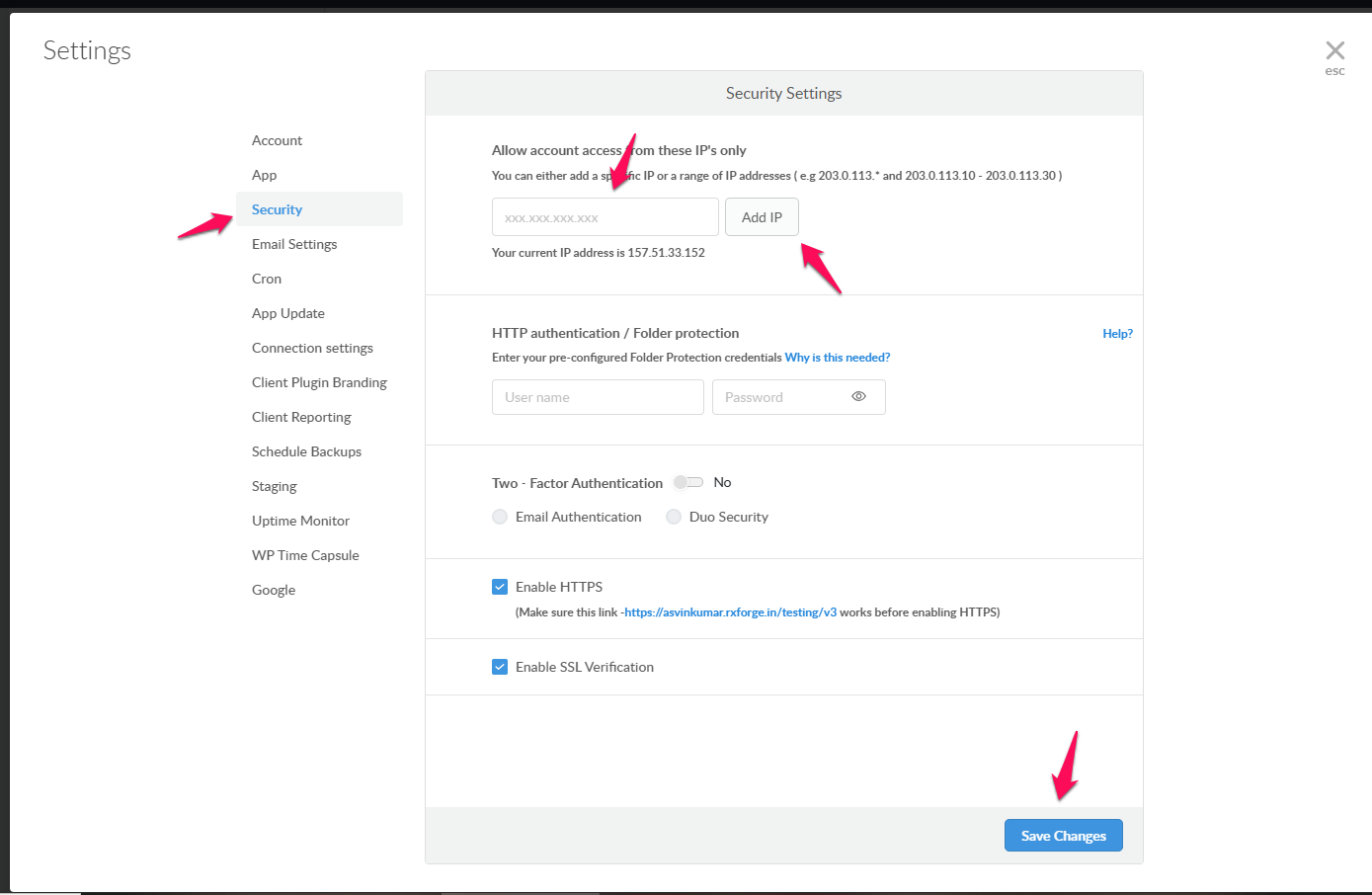Step 2: Go to Security Settings and enter your specific [ IP or IPs ], i.e. Settings → Security Tab → “Allow Account Access From These IPs Only” Section → Enter your IP, then click the [ Add IP ] button and make sure to click the [ Save Changes ] button.