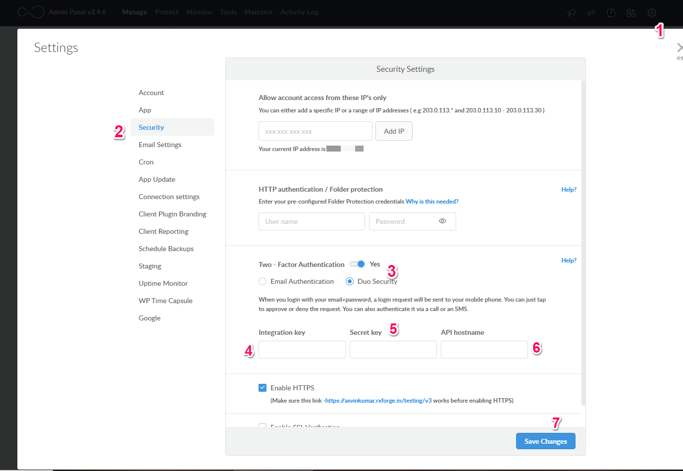 Step 2: Go to Security Settings, then enter “Integration Details”, i.e. Settings → Security Tab → “Two-Factor Authentication” Section → Select [ Duo Security ] then enter your Duo security integration details, make sure to Click [ Save Changes ] button.