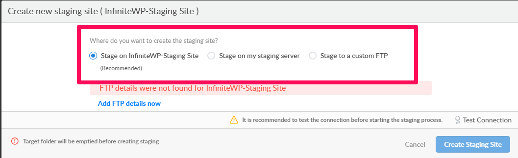 Please select Staging on to your same server and click Add FTP Details now.