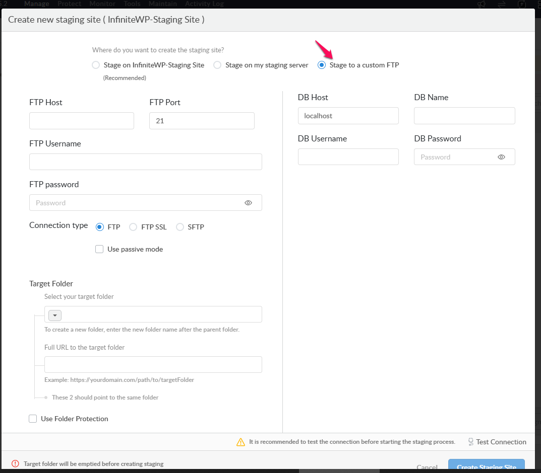 Choose Stage to a custom FTP and fill in the FTP server and Database details here. Finally, click Create Staging site.